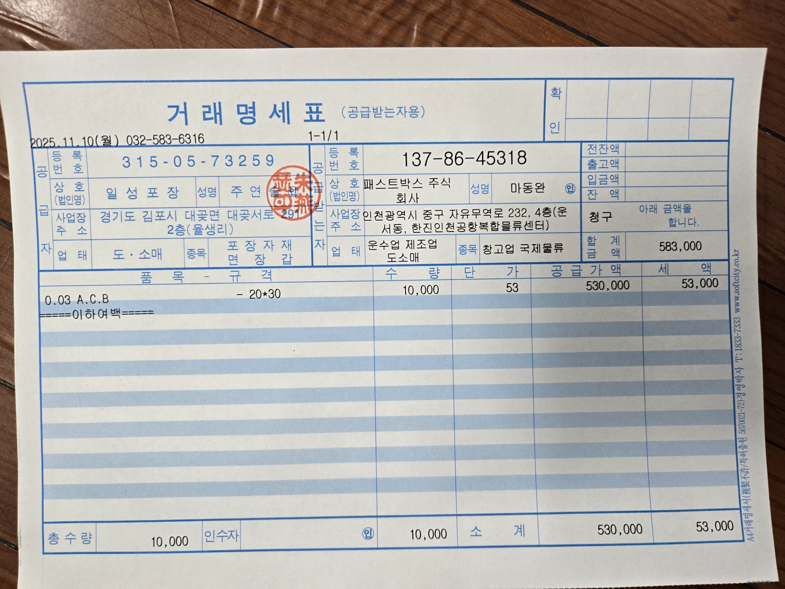 #1. 에어봉투3/20/30 / 수량 : 10,000 / 규격 : 0.03*20*30