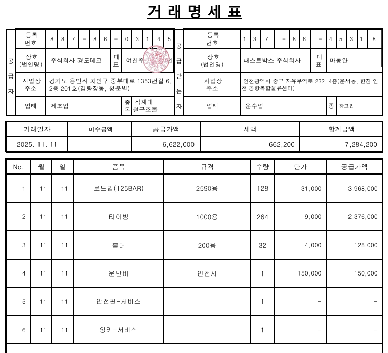 #4. 운임비 / 수량 : 1 / 규격 :